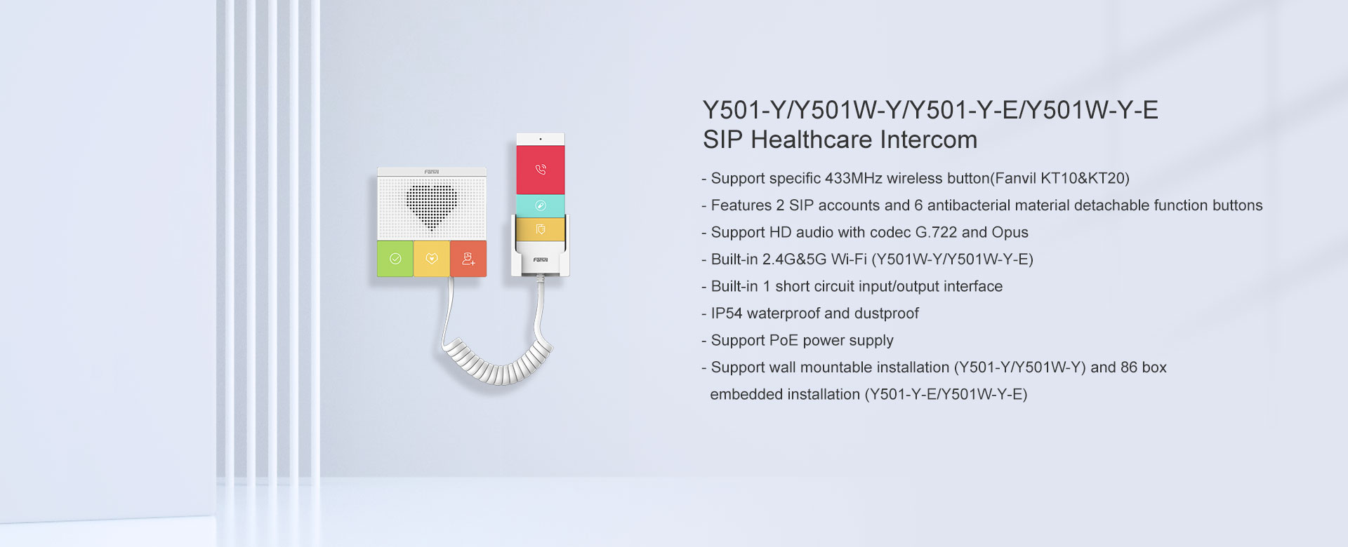 Los intercomunicadores SIP para el cuidado de la salud de la serie Fanvil Y501-Y están especialmente diseñados para la atención domiciliaria, la residencia de ancianos y otras aplicaciones en interiores, realizando la comunicación de emergencia, la protección de seguridad, la transmisión, etc. Cuentan con audio HD, 2 cuentas SIP, teclas DSS desmontables, IP54 resistente al agua y al polvo, y Wi-Fi 2.4G y 5G incorporado (Y501W-Y / Y501W-Y-E). La serie Y501-Y proporciona diferentes modos de instalación de caja estándar 86 integrada y montable en la pared, lo que le brinda una experiencia de comunicación de atención médica oportuna.