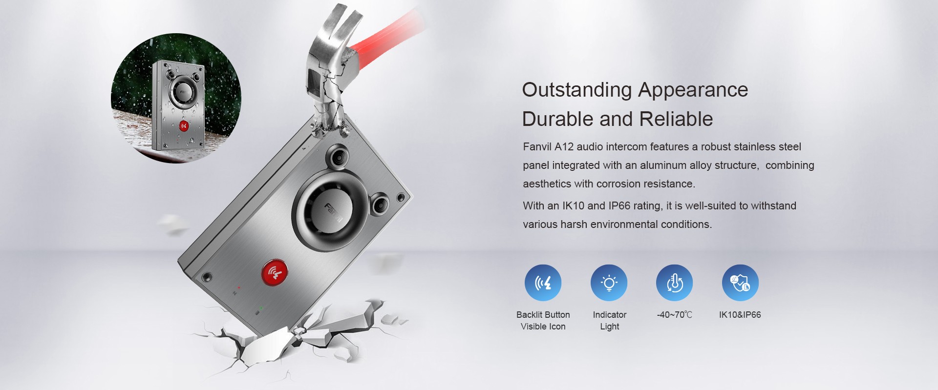 Intercomunicador de audio Fanvil A12. Altavoz incorporado de 10 W y un diseño único de cámara de sonido turbo, que ofrece un rendimiento de audio impresionante.
