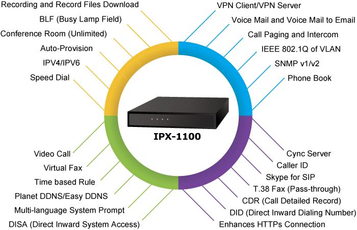 En la era de las comunicaciones de nueva generación, el IPX-1100 es compatible con IPv6 y conexión VPN (cliente/servidor) para proporcionar a los usuarios productos de comunicaciones más flexibles y ventajosos. Con la función PLANET DDNS, el IPX-1100 también ayuda a los usuarios a aplicar y recordar la información de inicio de sesión más fácilmente. Su función multilingüe ayuda al usuario a administrar el sistema de manera rápida y amigable. Además, el IPX-1100 es compatible con el servidor Lync al que se conectan el teléfono inteligente (mediante una aplicación de terceros) y el teléfono analógico a través de su comunicación con otros dispositivos del servidor Lync.