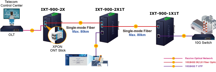 Los convertidores de medios convencionales generalmente admiten solo un par de conversiones de medios diferentes, como la conversión de una conexión de fibra a una de cobre. Pueden extender una conexión de cobre de 100 m a un máximo de 80 km de conexión de fibra óptica. En contraste, el IXT-900-2X1PD tiene dos puertos de fibra óptica y un puerto de cobre, lo que permite que los dos cables de fibra óptica se conecten a dispositivos separados por hasta 160 km para extender significativamente la distancia de implementación.