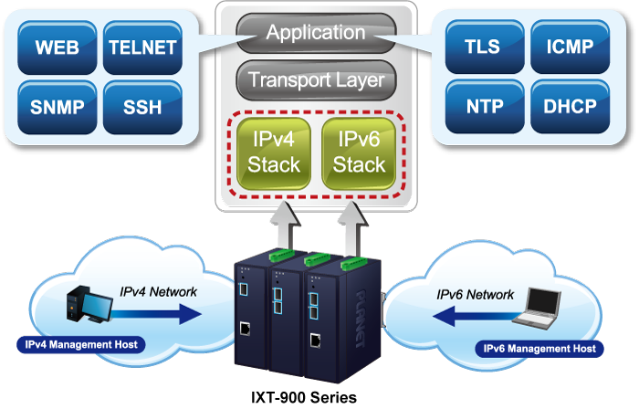 El IXT-900-2X1PD, compatible con los protocolos IPv6 e IPv4, ayuda a las empresas y a las empresas de telecomunicaciones a dar el salto a la era IPv6 con la menor inversión, ya que no es necesario sustituir ni revisar las instalaciones de red si se configura la red de borde FTTx IPv6.