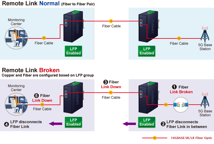 Link Fault Pass-through es una función de red que facilita la detección y propagación de errores o fallas de enlace de un dispositivo de red a otro. Ayuda a mantener la confiabilidad de la red y minimiza el tiempo de inactividad al permitir que los dispositivos respondan dinámicamente a las fallas de enlace. Link Fault Pass-through mejora la detección de fallas y permite procesos de resolución y solución de problemas más rápidos.