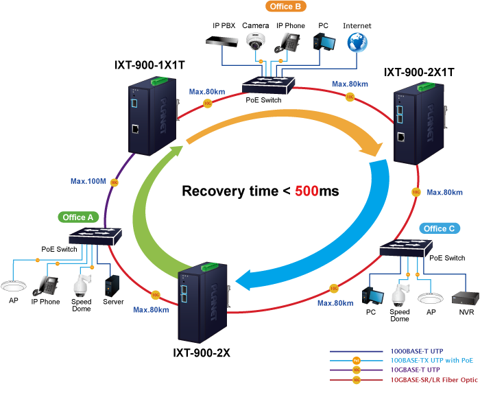El IXT-900-2X admite la tecnología de anillo redundante basada en software y cuenta con una capacidad de autorrecuperación rápida y sólida para evitar interrupciones e intrusiones externas. Incorpora la tecnología avanzada ERPS (conmutación de protección de anillo Ethernet) ITU-T G.8032, que garantiza una rápida autorrecuperación en redes de anillo. Con esta función avanzada, el tiempo de recuperación del enlace de datos puede ser tan rápido como 500 ms.
