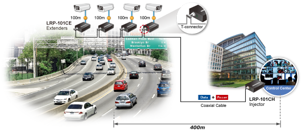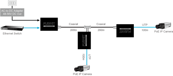 La solución PoE de largo alcance de PLANET puede crear fácilmente un sistema de alimentación para cámaras IP controladas de forma centralizada en una infraestructura de red de alta disponibilidad. Ofrece a los usuarios la flexibilidad de ampliar la red de área pequeña con un conector BNC en T para compartir cuatro nodos por puerto cuando sea necesario.