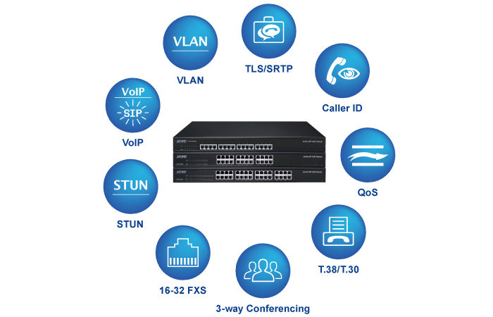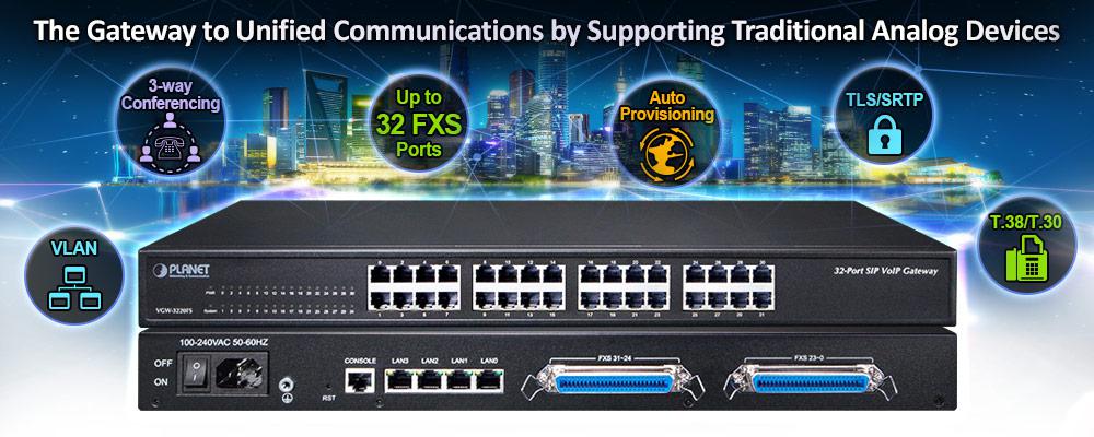La puerta de enlace VoIP SIP de 32 puertos de clase empresarial PLANET VGW-3220FS proporciona una mayor flexibilidad durante la migración a las comunicaciones unificadas al admitir los dispositivos analógicos tradicionales. Estos dispositivos incluyen teléfonos analógicos, máquinas de fax, módems, sistemas de correo de voz y altavoces.