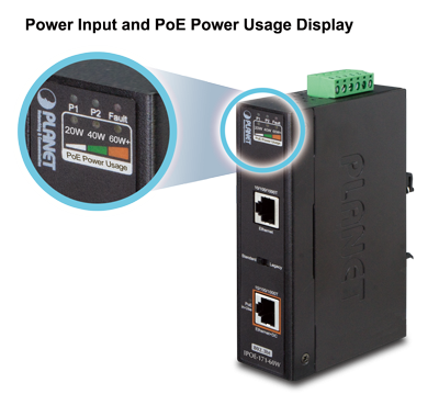 El IPOE-171-60W ayuda a los usuarios a monitorear el estado actual de la entrada de energía y el uso de energía PoE de manera fácil y eficiente a través de su indicador LED avanzado. “Entrada de energía” permite al usuario conocer el estado de la entrada de energía. “Uso de energía PoE” que se muestra en el panel del IPOE-171-60W tiene tres indicadores LED de diferentes usos de energía. A través del LED de uso de energía, el IPOE-171-60W permite al administrador monitorear el estado del uso de energía de los PD conectados en tiempo real.