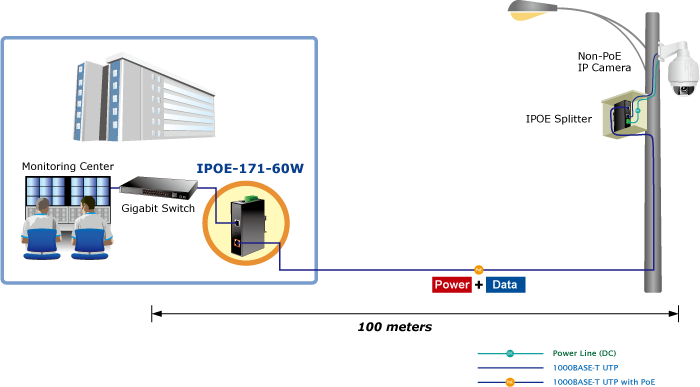 El IPOE-171-60W entrega datos digitales Ethernet con alimentación de CC a través de cables de par trenzado como un inyector de alimentación a través de Ethernet de 60 vatios, y el divisor de alimentación a través de Ethernet ultra conectado, el IPOE-173S, separará los datos digitales y la alimentación en tres salidas opcionales (12 V/24 V CC) con una distancia de hasta 100 metros.