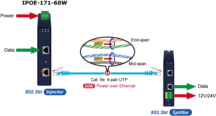 En lugar de suministrar energía a través de UTP trenzado de 2 pares, ya sea en el extremo (pines 1, 2, 3 y 6) o en el medio (pines 4, 5, 7 y 8), el IPOE-171-60W brinda la capacidad de suministrar hasta 60 vatios de energía mediante el uso de los cuatro pares de cableado Ethernet Cat. 5e/6 estándar.