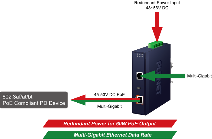 PLANET IPOE-171-60W es un inyector de alimentación a través de Ethernet industrial de un solo puerto 802.3bt con un máximo de 60 vatios de potencia de salida a través de cables Ethernet. También está equipado con dos interfaces de cobre RJ45 de 100 M/1 G/2,5 G/5 GBASE-T para gestionar cantidades extremadamente grandes de transmisión de datos.