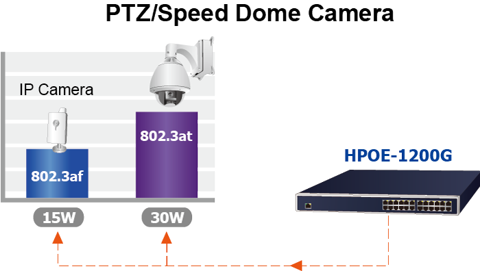 La alimentación en línea PoE que adopta el estándar IEEE 802.3at Power over Ethernet Plus permite que el HPOE-1200G pueda entregar por puerto hasta 36 vatios de potencia a cada PD remoto compatible con PoE. Posee el doble de capacidad de potencia que el PoE 802.3af convencional y es una solución ideal para satisfacer la creciente demanda de dispositivos de red que consumen más energía, como PTZ (pan, tilt y zoom), cámaras de red domo de velocidad, teléfonos de pantalla táctil a color o de video y voz sobre IP (VoIP), puntos de acceso LAN inalámbricos 802.11ac multicanal y otros dispositivos de red.