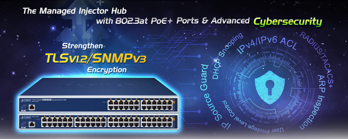 La serie HPOE Managed PoE Injector Hub recientemente mejorada de PLANET, una solución PoE administrada y rápida de alta densidad y montable en bastidor, está diseñada para actualizar perfectamente una infraestructura de red existente al sistema de red IEEE 802.3at Power over Ethernet Plus sin reemplazar el conmutador Ethernet existente. Las funciones de administración de la serie HPOE Managed PoE Injector Hub se han mejorado al nuevo estilo web que incluye los protocolos TLSv1.2 y TLSv1.3, el servicio PLANET DDNS/Easy DDNS, el sistema PLANET NMS y PLANET CloudViewer, entre otros.