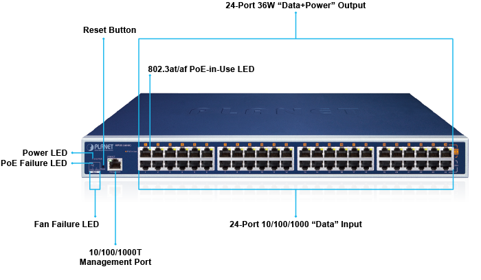 El HPOE-2400G se instala entre un conmutador Ethernet normal y los PD. Hay un total de 48 puertos RJ45 STP en el panel frontal del HPOE-2400G, de los cuales 24 puertos están en la pila inferior y funcionan como "entrada de datos", mientras que los otros 24 puertos están en la pila superior y funcionan como "salida PoE (datos y potencia)". Tanto la potencia como los datos se transfieren simultáneamente a través de los cables UTP a los PD sin afectar el rendimiento y las funciones de la red existente.