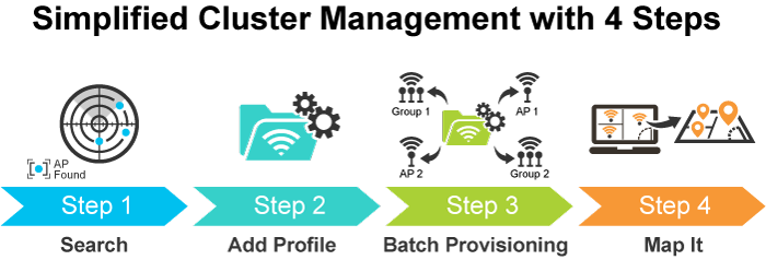 Por ejemplo, para configurar varios Smart AP del mismo modelo, los VR-300F y VR-300FP permiten agruparlos en un grupo gestionado para una gestión unificada. Según los requisitos, los AP inalámbricos se pueden ampliar o eliminar de forma flexible de un grupo de AP inalámbricos en cualquier momento. El clúster de AP se beneficia de la provisión masiva y la actualización masiva de firmware a través de un único punto de entrada en lugar de tener que configurar los ajustes en cada uno de ellos por separado.