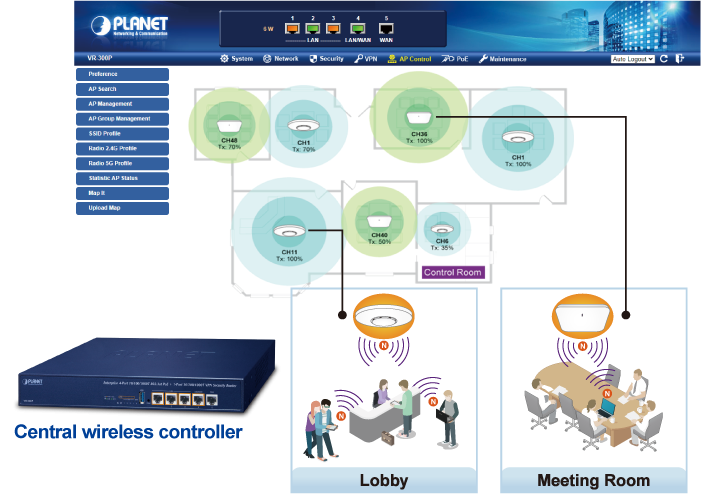 El VR-300 proporciona una administración centralizada de la serie PLANET Smart AP a través de una interfaz gráfica de usuario web fácil de usar. Es fácil configurar el AP para la SSID inalámbrica, la banda de radio y las configuraciones de seguridad. Con un proceso de configuración de cuatro pasos, se pueden entregar simultáneamente diferentes propósitos de perfiles inalámbricos a múltiples AP o grupos de AP para minimizar el tiempo, el esfuerzo y el costo de implementación.