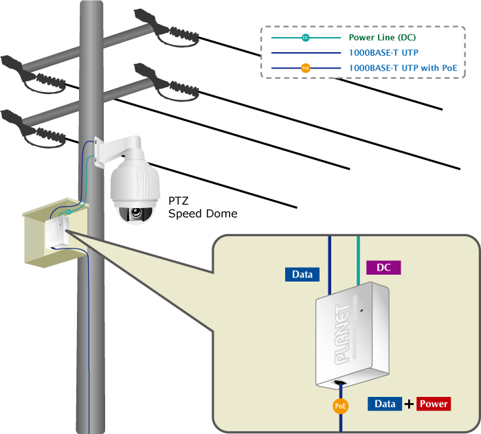 El POE-162S puede dividir la potencia de 52~56 V CC a través del cable Ethernet en una salida de potencia de 12 V o 24 V CC seleccionable. Está diseñado específicamente para satisfacer la demanda de equipos de red que requieren mayor potencia, como cámaras de red PTZ (pan, tilt y zoom), cámaras domo de velocidad PTZ, teléfonos de pantalla táctil a color/video y voz sobre IP (VoIP), puntos de acceso LAN inalámbricos multicanal (11a/ac/b/g/n) y otros dispositivos de red que necesitan mayor potencia para funcionar normalmente pero que no pueden satisfacerse con el estándar IEEE 802.3af PoE. El divisor de alimentación por Ethernet Gigabit IEEE 802.3at POE-162S es una solución ideal que permite que los dispositivos de red con alto consumo de energía se alimenten directamente a través de la interfaz RJ45 sin la necesidad de tomas de corriente ni cableado eléctrico.