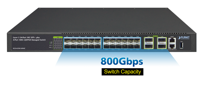 PLANET XGS-6350-24X4C es un conmutador gestionable de capa 3 de alto rendimiento que cumple con los requisitos de red de próxima generación de centros de datos, campus y empresas. Tiene 24 interfaces de fibra 10G SFP+ y 4 interfaces de fibra 40G/100GbE QSFP28 de alta densidad entregadas en un estuche resistente de 1RU.