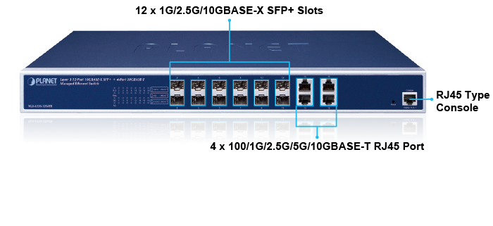 PLANET XGS-6320-12X4TR es un switch Ethernet de 10 Gbps con todos los puertos y totalmente administrado diseñado para la demanda de alto ancho de banda para equipos de red avanzados, como puntos de acceso inalámbricos Wi-Fi 6/6E, NAS, estaciones de trabajo y aquellos con interfaces de fibra o cobre de 10 Gbps. Cuenta con 4 puertos de cobre 10GBASE-T y 12 puertos de fibra 10GBASE-X SFP+ que están diseñados de manera flexible para extender la distancia de conexión.