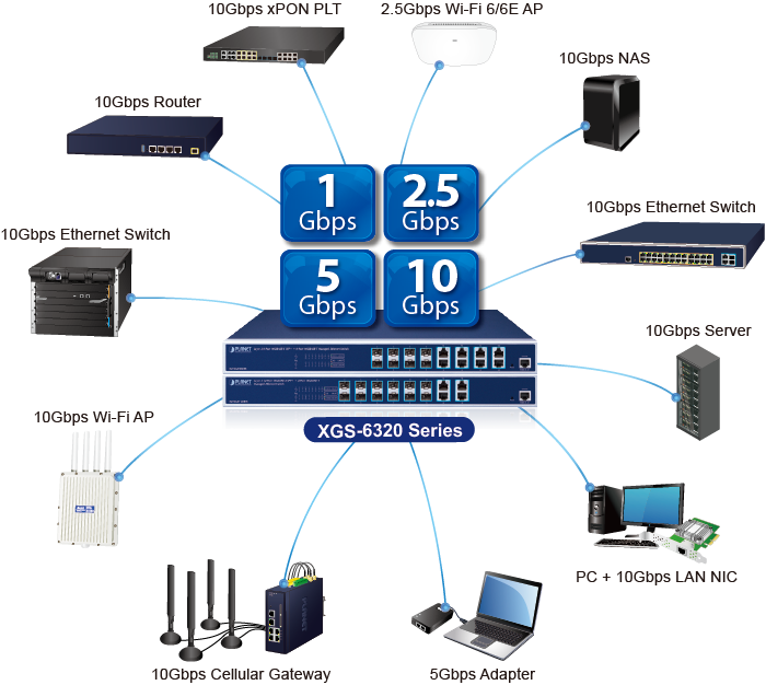 La serie PLANET XGS-6320 tiene la capacidad de alcanzar una alta velocidad de 10 Gbps a través de cableado de cobre o fibra óptica, lo que ayuda a acelerar el rendimiento de la transmisión de datos de gran tamaño. Las interfaces de cobre 10GBASE-T integradas admiten negociación automática de 5 velocidades (10G/5G/2,5G/1G/100) y transmisión de datos de 10 Gbps con el cableado UTP Cat6A/Cat7 existente, lo que significa que la velocidad se puede aumentar sin costos. Definitivamente puede brindarle la velocidad que necesita y su Plug and Play hace que la instalación sea fácil.