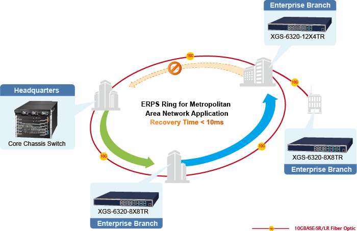 La serie XGS-6320 admite la tecnología de anillo redundante y presenta una capacidad de autorrecuperación rápida y sólida para evitar interrupciones e intrusiones externas. Incorpora tecnología avanzada ITU-T G.8032 ERPS (Ethernet Ring Protection Switching) y protocolo Spanning Tree (802.1w RSTP) en la red del cliente para mejorar la confiabilidad del sistema y el tiempo de funcionamiento en entornos hostiles. En una determinada red de anillo simple, el tiempo de recuperación podría ser inferior a 10 ms para que la red vuelva rápidamente a funcionar con normalidad.