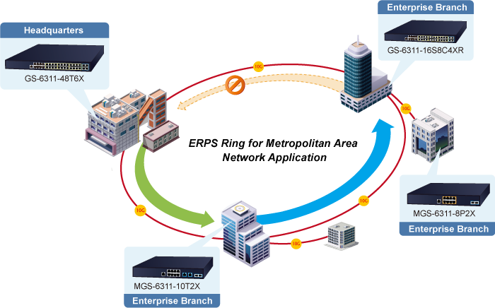 El MGS-6311-8P2X admite la tecnología de anillo redundante y cuenta con una capacidad de autorrecuperación rápida y sólida para evitar interrupciones e intrusiones externas. Incorpora la tecnología avanzada ITU-T G.8032 ERPS (Ethernet Ring Protection Switching) y el protocolo Spanning Tree (802.1s MSTP) en la red del cliente para mejorar la confiabilidad del sistema y el tiempo de funcionamiento en entornos hostiles. En una determinada red de anillo simple, el tiempo de recuperación podría ser inferior a 15 ms para que la red vuelva rápidamente a funcionar con normalidad.