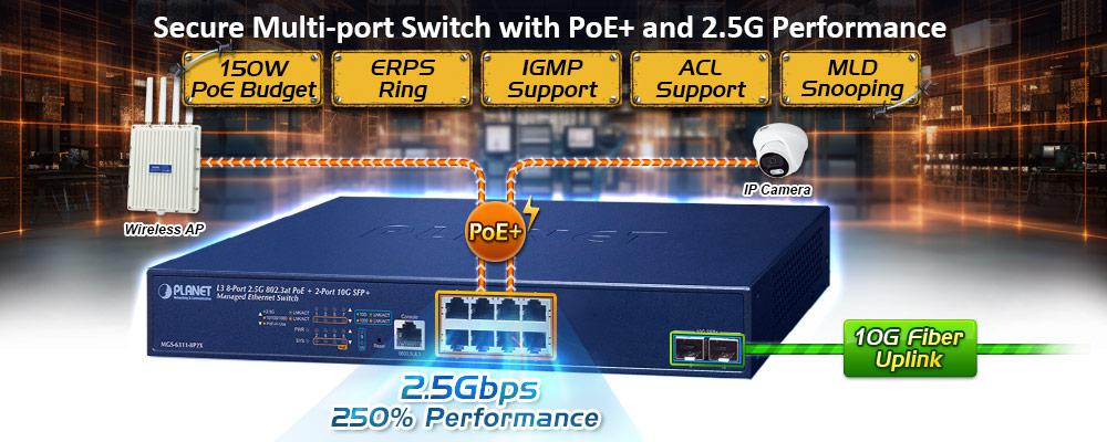 PLANET MGS-6311-8P2X es un nuevo switch multigigabit administrado de capa 3 que proporciona datos de 2,5 Gbps a través de cables UTP, diseñado para la demanda de equipos de red que requieren un gran ancho de banda, como puntos de acceso inalámbricos Wi-Fi 6 802.11ax, NAS, estaciones de trabajo y aquellos con interfaces 2.5GBASE-T. Cuenta con 8 puertos de cobre 10/100/1000/2500BASE-T que admiten la función de inyector PoE+ 802.3at, un presupuesto de energía PoE total de hasta 150 vatios y 2 puertos de fibra SFP+ 1G/10GBASE-X adicionales que están diseñados de manera flexible para extender la distancia de conexión.
