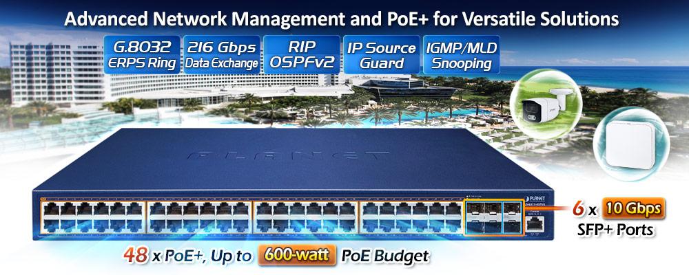El GS-6311-48P6X ofrece un rendimiento de alta densidad, enrutamiento estático de capa 3, RIP (protocolo de información de enrutamiento) y OSPF (primero la ruta más corta abierta). Con interfaces de 10 Gbps y una red de conmutación de 216 Gbps, el GS-6311-48P6X puede manejar cantidades extremadamente grandes de datos en una topología segura que se vincula a una red troncal empresarial o a servidores de alta capacidad. Las potentes funciones de enrutamiento multicast y seguridad de red hacen que el GS-6311-48P6X realice un control efectivo del tráfico de datos para ISP y VoIP empresarial, transmisión de video y aplicaciones de multidifusión.