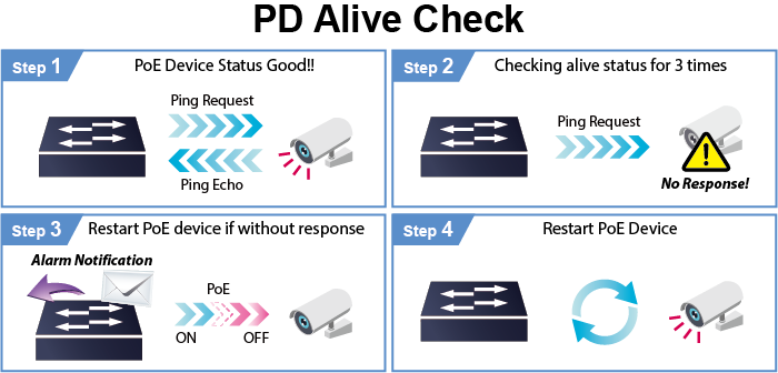 El XGS-6320-8UP4X se puede configurar para supervisar el estado de los dispositivos alimentados (PD) conectados en tiempo real a través de una acción de ping. Si un PD deja de funcionar y de responder, el XGS-6320-8UP4X reciclará la energía del puerto PoE y hará que el PD vuelva a funcionar. Esto mejora enormemente la confiabilidad, ya que el puerto PoE asignado reinicia automáticamente el PD, lo que reduce la carga de gestión del administrador.
