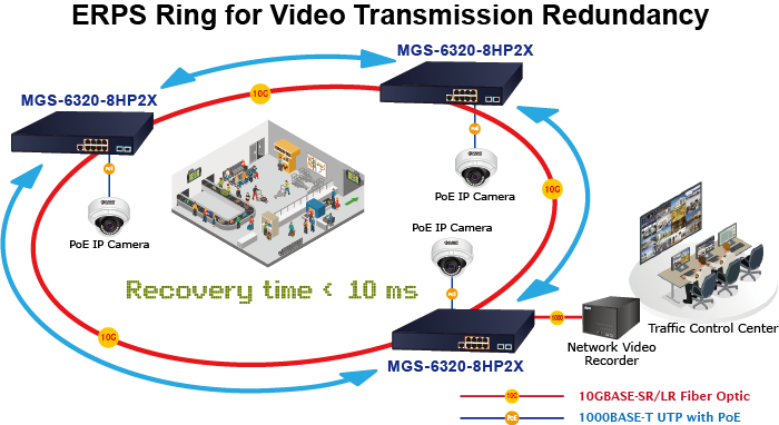 El MGS-6320-8HP2X admite la tecnología de anillo redundante y cuenta con una capacidad de autorrecuperación rápida y sólida para evitar interrupciones e intrusiones externas. Incorpora la tecnología avanzada ITU-T G.8032 ERPS (Ethernet Ring Protection Switching) y el protocolo Spanning Tree (802.1w RSTP) en la red del cliente para mejorar la confiabilidad del sistema y el tiempo de funcionamiento en entornos hostiles. En una determinada red de anillo simple, el tiempo de recuperación podría ser inferior a 10 ms para que la red vuelva rápidamente a funcionar con normalidad.