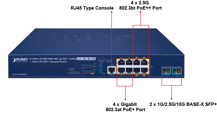 PLANET MGS-6320-8HP2X es un nuevo switch multigigabit administrado de capa 3 que proporciona una velocidad de datos de 2,5 Gbps y PoE++ 802.3bt a través de cables UTP, diseñado para la demanda de equipos de red que requieren un gran ancho de banda, como puntos de acceso inalámbricos Wi-Fi 6 802.11ax, NAS, estaciones de trabajo y aquellos con interfaces 2.5GBASE-T. Cuenta con 4 puertos de cobre 10/100/1000BASE-T con función de inyector PoE+ 802.3at, 4 puertos de cobre 100/1000/2500BASE-T con función de inyector PoE++ 802.3bt, un presupuesto de potencia PoE total de hasta 240 vatios y 2 puertos de fibra SFP+ 1G/2.5G/10GBASE-X adicionales que están diseñados de manera flexible para extender la distancia de conexión. Con una capacidad de enlace de datos tan favorable, un rendimiento de enrutamiento de capa 3 basado en hardware, un motor de conmutación de capa 2 y capa 4 e interfaces de gestión IPv6/IPv4 fáciles de usar pero avanzadas, ayuda a acelerar la implementación de la red inalámbrica y de IoT de próxima generación para empresas y ciudades inteligentes.