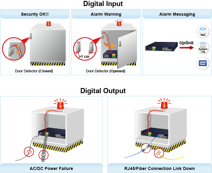 El MGS-6320-2T6S2X admite entrada digital y salida digital en el panel frontal. La alarma externa ofrece a los técnicos la posibilidad de utilizar la entrada digital para detectar y registrar el estado de los dispositivos externos (como el detector de intrusión de puertas) para la alarma, ya que la salida digital se puede utilizar para avisar si el MGS-6320-2T6S2X tiene un enlace de puerto inactivo, un enlace activo o una falla de energía.
