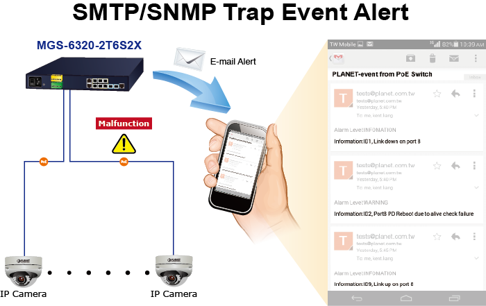 Aunque la mayoría de los software de gestión de cámaras o NVR ofrecen una función de alerta por correo electrónico SMTP, el MGS-6320-2T6S2X también ofrece una función de alerta de evento para ayudar a diagnosticar el dispositivo anormal debido a si hay o no una interrupción en la conexión de red.