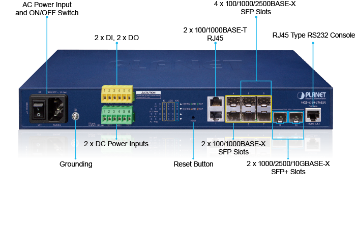 Para mejorar la fiabilidad y flexibilidad de la operación, el MGS-6320-2T6S2X está equipado con una unidad de fuente de alimentación de CA de 100 ~ 240 V y dos conectores de entrada de alimentación de CC adicionales de 24 ~ 57 V para la instalación de una fuente de alimentación redundante. Los sistemas de alimentación redundante están diseñados específicamente para manejar las demandas de instalaciones de alta tecnología que requieren la máxima integridad de la alimentación. Además, con la fuente de alimentación de CC de 24 ~ 57 V implementada, el MGS-6320-2T6S2X se puede aplicar como dispositivo de nivel de telecomunicaciones que podría ubicarse en la sala electrónica.