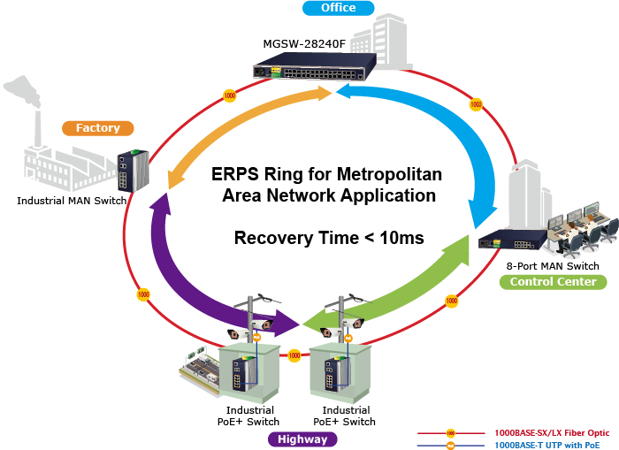 El MGSW-28240F es compatible con la tecnología de anillo redundante y cuenta con una capacidad de autorrecuperación rápida y sólida para evitar interrupciones e intrusiones externas. Incorpora tecnología avanzada ITU-T G.8032 ERPS (Ethernet Ring Protection Switching), protocolo Spanning Tree (802.1s MSTP) y un sistema de entrada de energía redundante en la red de automatización industrial del cliente para mejorar la confiabilidad del sistema y el tiempo de funcionamiento en entornos industriales hostiles. En una red Ring simple, el tiempo de recuperación del enlace de datos puede ser tan rápido como 10 ms.