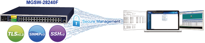 Además, el MGSW-28240F ofrece una gestión remota segura al admitir conexiones SSHv2, TLSv1.2 y SNMPv3 que cifran el contenido del paquete en cada sesión.
