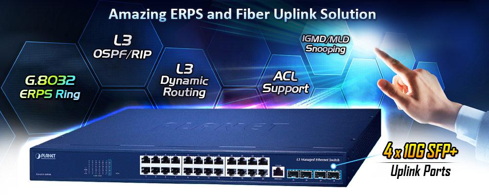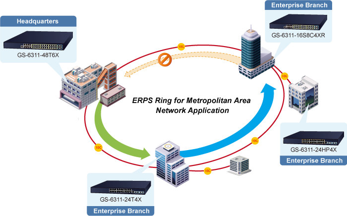 El GS-6311-24T4X admite la tecnología de anillo redundante y presenta una capacidad de autorrecuperación rápida y sólida para evitar interrupciones e intrusiones externas. Incorpora tecnología avanzada ITU-T G.8032 ERPS (Ethernet Ring Protection Switching) y protocolo Spanning Tree (802.1s MSTP) en la red del cliente para mejorar la confiabilidad del sistema y el tiempo de funcionamiento en entornos hostiles. En una determinada red de anillo simple, el tiempo de recuperación podría ser inferior a 50 ms para que la red vuelva rápidamente a funcionar con normalidad.