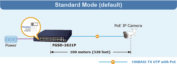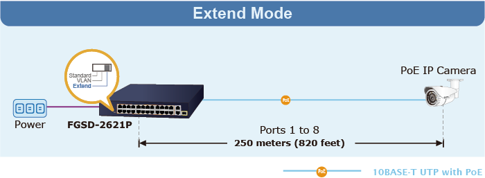Con esta nueva función, el FGSD-2621P proporciona una solución adicional para la extensión de distancia PoE+ 802.3at, ahorrando así el coste de instalación del cable Ethernet.