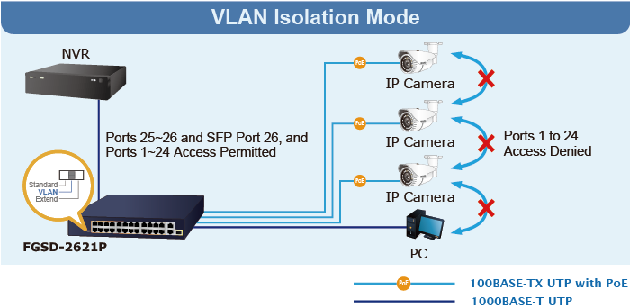 El FGSD-2621P le ofrece un sistema de vigilancia idealmente seguro a un costo total menor. El FGSD-2621P ofrece 24 puertos PoE+ 802.3at de 10/100 Mbps capaces de suministrar suficiente energía PoE a 24 cámaras IP IEEE 802.3af/IEEE 802.3at PoE+ al mismo tiempo. También puede conectarse con un NVR de 24 canales o tres NVR de 8 canales, conectados a un conmutador troncal y al centro de monitoreo. Con una arquitectura de conmutador de alto rendimiento, los archivos de video grabados de las cámaras IP PoE se pueden guardar en el sistema NVR, donde el administrador puede controlar y monitorear las imágenes de vigilancia tanto en la LAN local como en los sitios remotos.