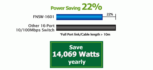Las balanzas inteligentes de potencia son un algoritmo inteligente que determina activamente el nivel de potencia adecuado en función de la longitud del cable. El FNSW-1601 detectaría automáticamente la longitud del cable Ethernet y ajustaría el uso de energía en consecuencia. El dispositivo conectado puede reducir sustancialmente el consumo total de energía, lo que contribuye significativamente al ahorro de energía. El FNSW-1601 utiliza un nuevo motor que permite ahorrar hasta un 22 % de energía, pero mantiene un alto rendimiento de manera eficiente.