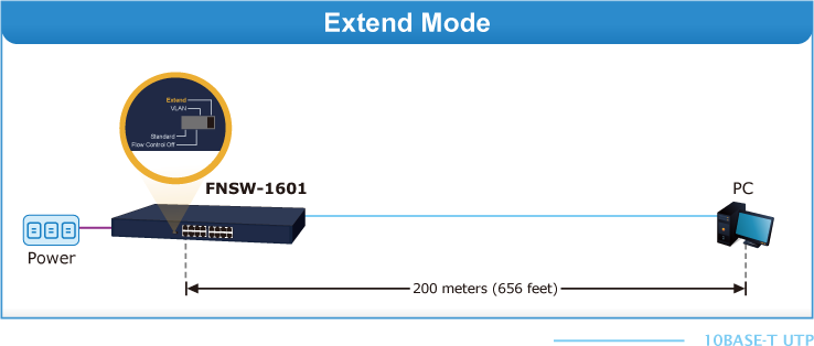 En el modo de funcionamiento "Extend", el FNSW-1601 funciona por puerto a una velocidad de funcionamiento dúplex de 10 Mbps, pero puede transmitir datos a una distancia de hasta 200 metros, superando el límite de 100 m del cable UTP Ethernet. Con esta nueva función, el FNSW-1601 proporciona una solución adicional para la extensión de la distancia, ahorrando así el coste de la instalación del cable Ethernet. Su función de aislamiento VLAN aísla cada puerto para evitar tormentas de difusión y defenderse de la suplantación de DHCP en el modo de funcionamiento "Extend".