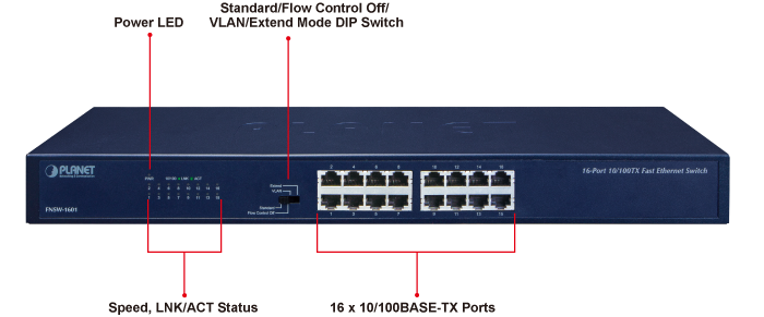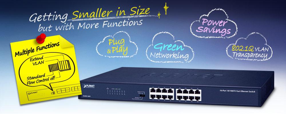 El conmutador de redes ecológicas PLANET FNSW-1601 es una solución ideal en línea con la tendencia mundial de ahorro de energía. El FNSW-1601 es un conmutador Fast Ethernet 10/100BASE-TX de 16 puertos, actualizado a partir de una versión anterior, que ofrece tanto beneficios de ahorro de energía como de alto rendimiento.