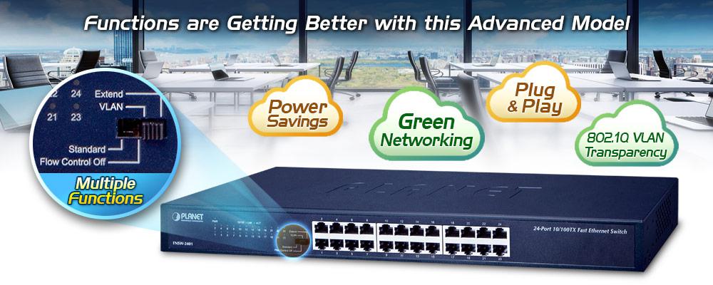 El conmutador de redes ecológico PLANET FNSW-2401 es una solución ideal en línea con la tendencia mundial de ahorro de energía. El FNSW-2401 es un conmutador Fast Ethernet 10/100BASE-TX de 24 puertos actualizado a partir de la versión anterior, lo que le brinda los beneficios del ahorro de energía y el alto rendimiento.