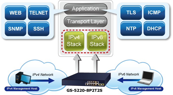 Con compatibilidad con el protocolo IPv6/IPv4 e interfaces de administración sencillas y amigables, el GS-5220-8P2T2S es la mejor opción para que los proveedores de servicios de vigilancia IP, VoIP e inalámbricos se conecten con la red IPv6. También ayuda a las PYMES a ingresar a la era IPv6 con la menor inversión y sin tener que reemplazar las instalaciones de red, incluso si los ISP establecen la red de borde FTTx IPv6.