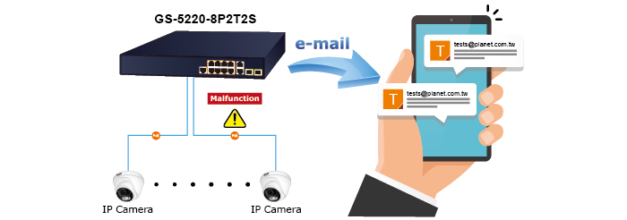 Aunque la mayoría de los software de gestión de cámaras o NVR ofrecen una función de alerta por correo electrónico SMTP, el GS-5220-8P2T2S también ofrece una función de alerta de eventos para ayudar a diagnosticar el dispositivo anormal debido a si hay o no una interrupción de la conexión de red, pérdida de alimentación PoE o la respuesta de reinicio por el proceso PD Alive Check.