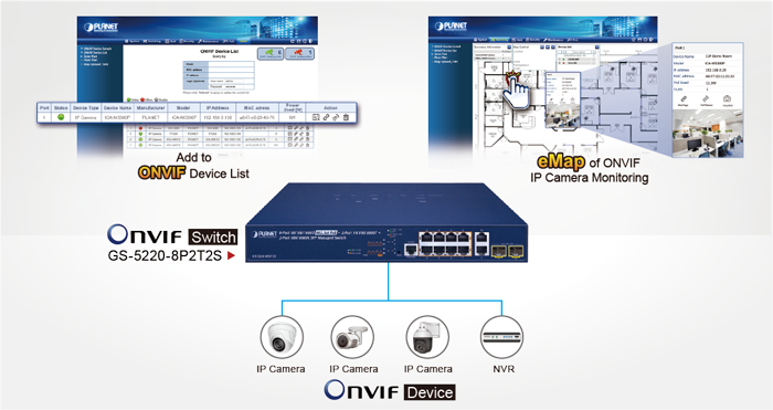 PLANET ha desarrollado recientemente una característica increíble, la compatibilidad con ONVIF, que está diseñada específicamente para cooperar con videovigilancias IP. Desde la interfaz gráfica de usuario del GS-5220-8P2T2S, solo necesita un clic para buscar y mostrar todos los dispositivos ONVIF a través de la aplicación de red. Además, puede cargar imágenes del piso al conmutador y monitorear de forma remota lo que está sucediendo en la línea de producción. Además, puede obtener información de vigilancia en tiempo real y el estado en línea/fuera de línea, y puede tener control de reinicio PoE desde la interfaz gráfica de usuario.