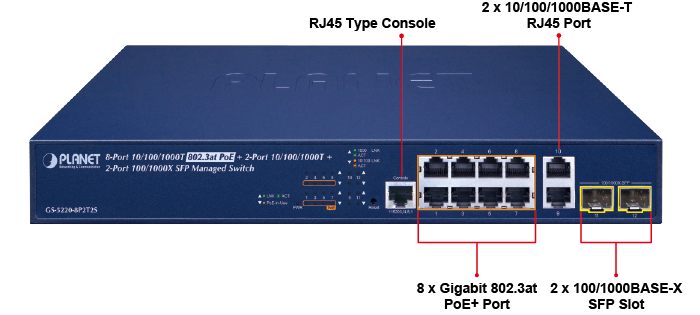 El switch Gigabit administrado de capa 2 PLANET GS-5220-8P2T2S admite los protocolos IPv4 e IPv6 y el enrutamiento estático de capa 3, y ofrece 8 puertos 10/100/1000BASE-T con PoE+ 802.3at de 36 vatios, 2 puertos Gigabit de cobre adicionales y otras 2 ranuras de fibra SFP 100/1000BASE-X adicionales. Cada uno de los ocho puertos Gigabit ofrece 36 vatios de potencia, con un presupuesto de potencia total de hasta 240 vatios para los diferentes tipos de aplicaciones PoE que se emplean. Ofrece una solución de red Power over Ethernet rápida, segura y rentable para la vigilancia de seguridad IP para pequeñas empresas y grandes empresas.