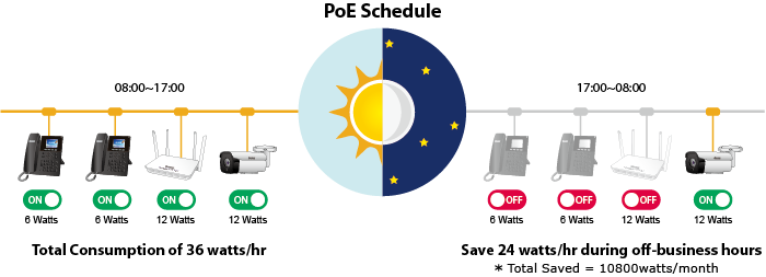 En el marco de la tendencia mundial de ahorro de energía y para contribuir a la protección del medio ambiente, el GS-4210-16P4C puede controlar eficazmente la fuente de alimentación, además de su capacidad de proporcionar una gran potencia en vatios. La función de "programación PoE" le ayuda a habilitar o deshabilitar la alimentación de energía PoE para cada puerto PoE durante intervalos de tiempo específicos y es una función poderosa para ayudar a las PYMES o empresas a ahorrar energía y dinero. También aumenta la seguridad al apagar los dispositivos de almacenamiento que no deberían estar en uso durante las horas no laborales.