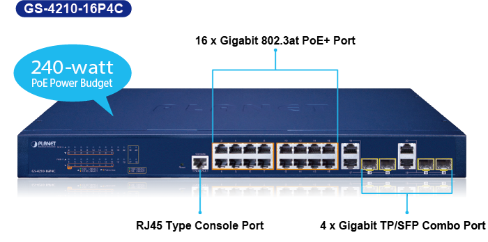 PLANET GS-4210-16P4C es un switch administrado PoE+ Gigabit de costo optimizado que incluye funciones PoE inteligentes PLANET para mejorar la disponibilidad de aplicaciones empresariales críticas. Proporciona administración de doble pila IPv6/IPv4 y motor de conmutación Gigabit L2/L4 integrado junto con 16 puertos 10/100/1000BASE-T con PoE+ 802.3at de 30 vatios y 4 puertos combo Gigabit TP/SFP adicionales. Con un presupuesto de energía total de hasta 240 vatios para diferentes tipos de aplicaciones PoE, el GS-4210-16P4C proporciona una solución de red Power over Ethernet rápida, segura y rentable para pequeñas empresas y grandes empresas.