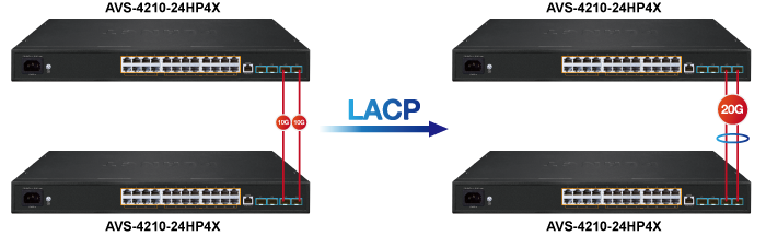 El AVS-4210-24HP4X se puede programar para funciones avanzadas de administración de conmutadores, como agregación de enlaces de puertos dinámicos, VLAN 802.1Q y VLAN Q-in-Q, protocolo de árbol de expansión múltiple (MSTP), protección de bucle y BPDU, vigilancia IGMP y vigilancia MLD. A través de la agregación de enlaces, el AVS-4210-24HP4X permite la operación de un enlace troncal de alta velocidad para combinarlo con varios puertos y también admite conmutación por error. Además, el protocolo de descubrimiento de capa de enlace (LLDP) es el protocolo de capa 2 incluido para ayudar a descubrir información básica sobre los dispositivos vecinos en el dominio de transmisión local.