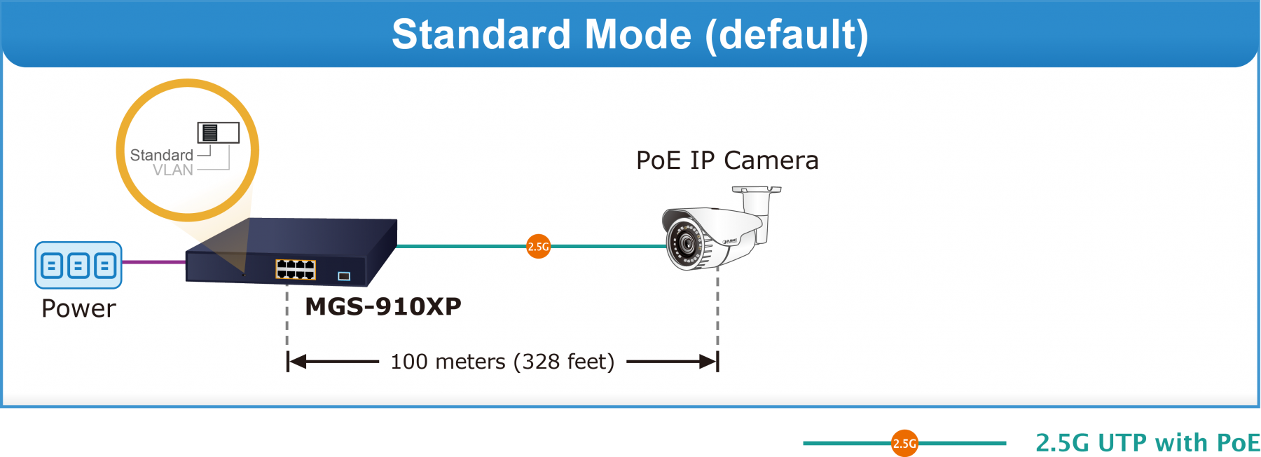 Todas las interfaces de cobre RJ45 del MGS-910XP admiten negociación automática de 10/100/1000/2500 Mbps para una detección de velocidad óptima a través de cables RJ45 de categoría 5, 5e o 6. Admiten la función MDI/MDI-X automática estándar que puede detectar el tipo de conexión a cualquier dispositivo Ethernet sin necesidad de cables especiales de conexión directa o cruzada.