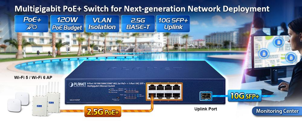 El switch multigigabit de valor añadido MGS-910XP de PLANET, ideal para velocidades de datos de 2,5 Gbps y PoE sobre cables UTP, está diseñado para la demanda de equipos de red que requieren un gran ancho de banda, como los puntos de acceso inalámbricos 802.11ax y 802.11ac Wave 2. Con una configuración de hardware perfecta con 8 puertos 10/100/1000/2500BASE-T con PoE+ 802.3at de 32 vatios y 1 puerto de fibra SFP+ 10GBASE-X adicional, el MGS-910XP rompe la limitación de ancho de banda de la conexión de la red inalámbrica con la red cableada.